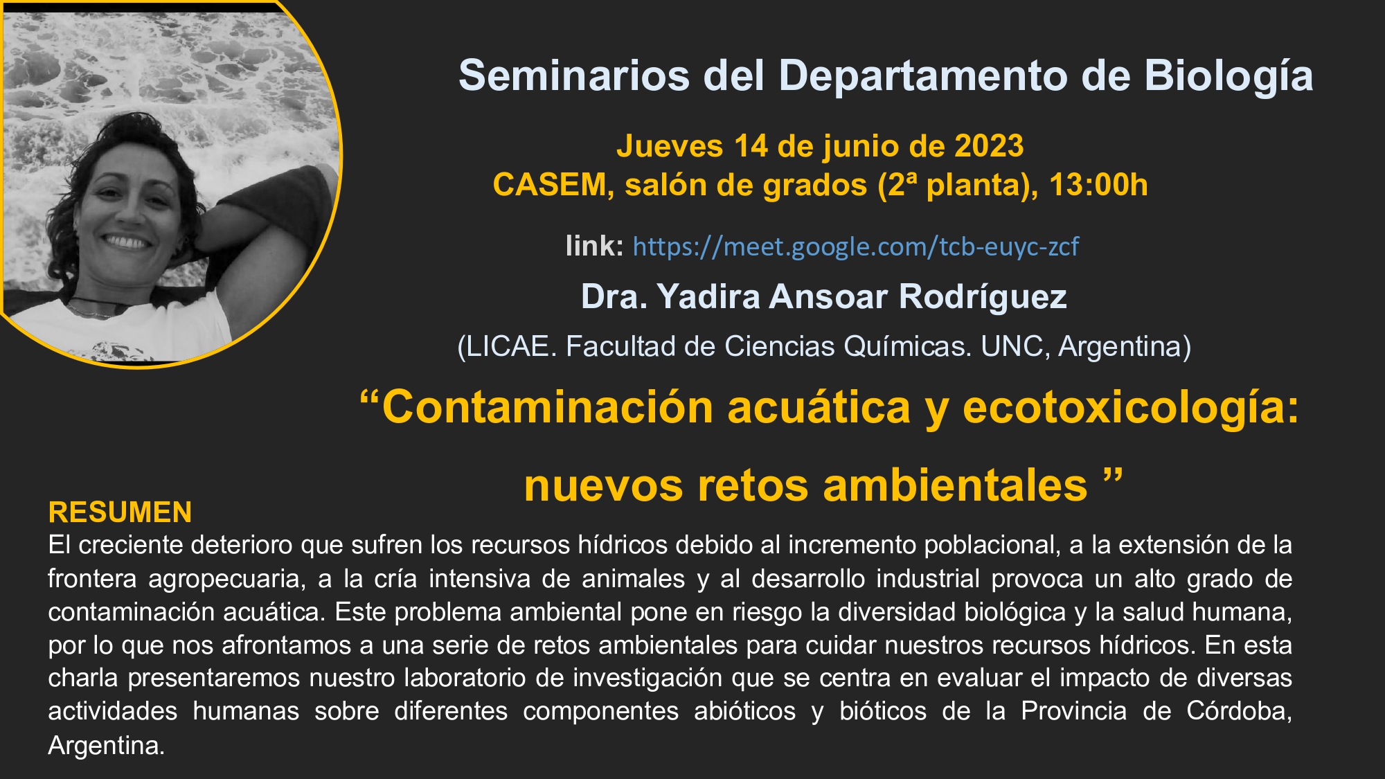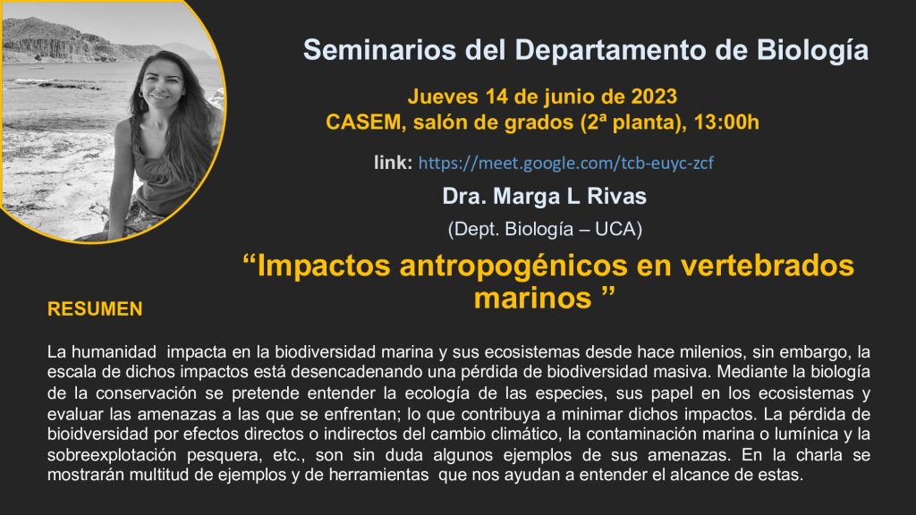 En esta ocasión Marga L Rivas, investigadora postdoctoral en la UCA nos hablará sobre vertebrados marinos y sus amenazas, y la investigadora visitante Yadira Ansoar sobre contaminación acuática y ecotoxicología. Adjuntamos cartel con título y resumen.